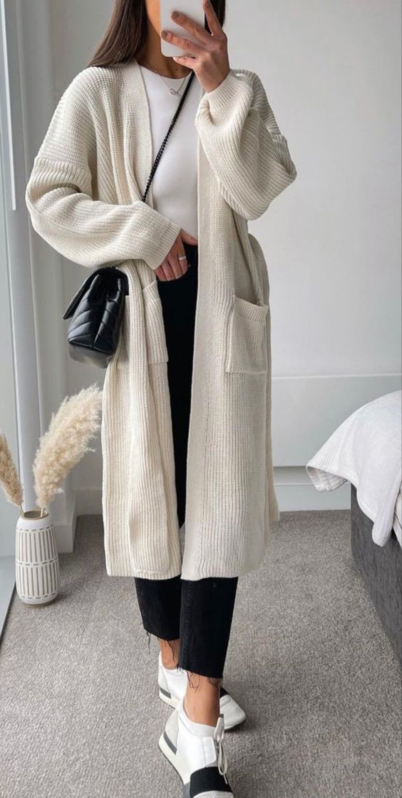Para dias mais amenos, no entanto, os looks com casacos longos podem trazer peças menos densas na combinação. Um bom exemplo vem do longo com fio como os cardigans. Outra peça super confortável e que super combina com tênis e cores claras.