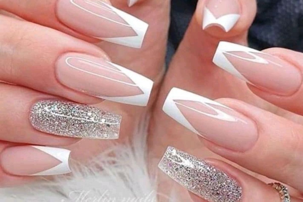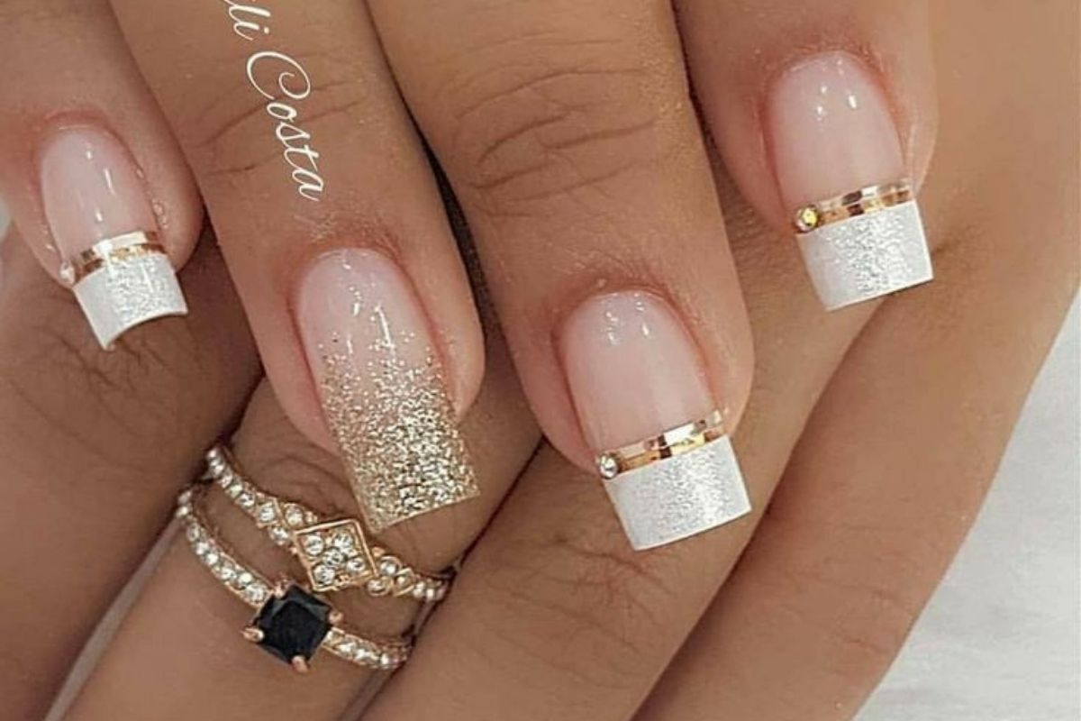 No entanto, se você quer algo mais extravagante, pode combinar o charme da francesinha angular com o brilho sutil de uma filha única em glitter.