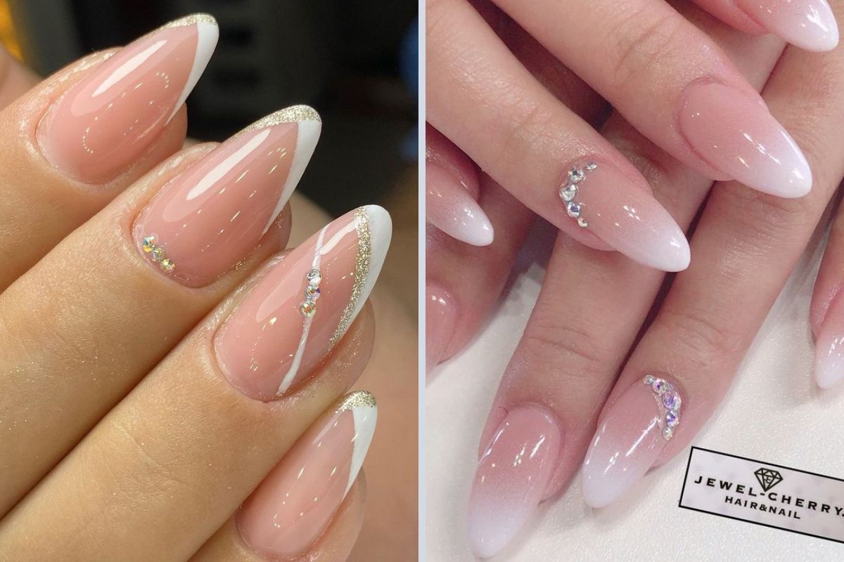 Por fim, às vezes, menos é mais! Dito isso, opte por uma cor sólida, como um rosa clarinho, para suas unhas almond e adicione apenas alguns detalhes brilhantes.