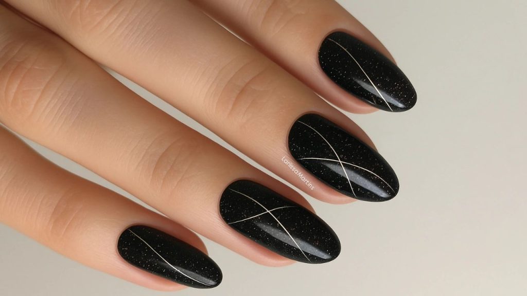 A unha almond preta com linhas metálicas é para quem gosta de detalhes finos que fazem toda a diferença. As linhas douradas ou prateadas sobre o fundo escuro deixam tudo mais sofisticado, sem pesar.