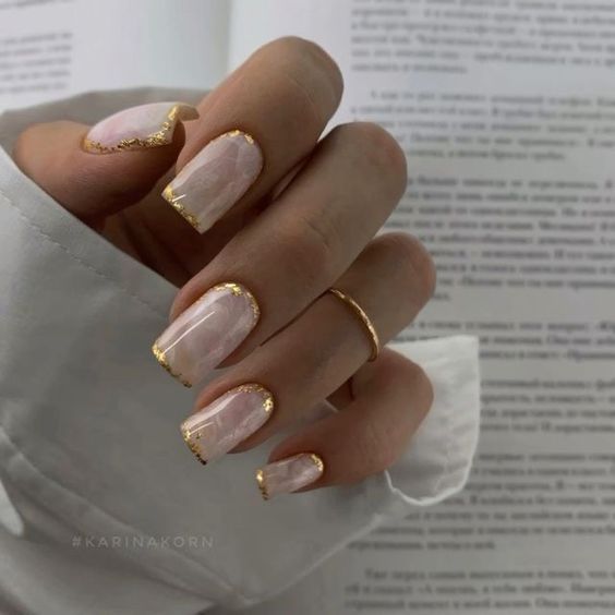1. Efeito mármore branco com dourado traz unhas brancas incrivelmente delicadas para o visual