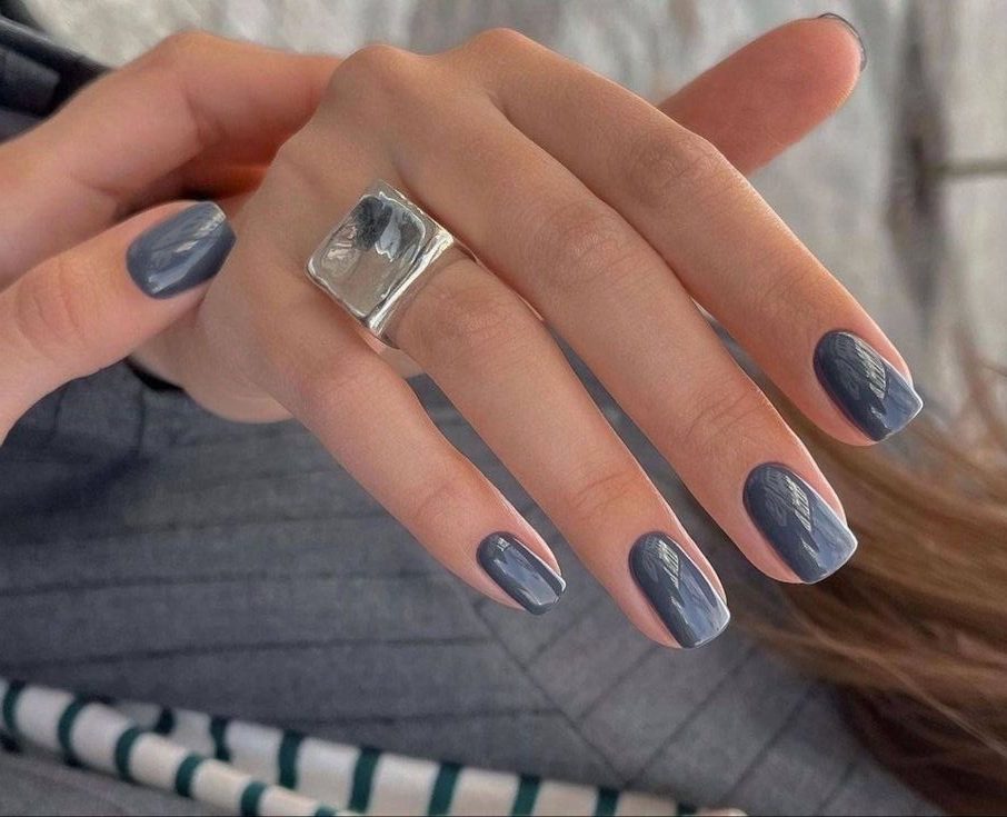 O cinza escuro, quase grafite, aparece entre os tons neutros preferidos de 2025. Com acabamento polido e superfície espelhada, esse visual é ideal para quem gosta de manter as unhas em um estilo mais urbano.