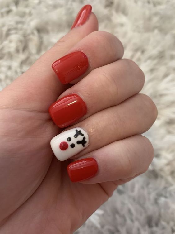 Para uma unha de natal com modelo infantil ainda mais fácil, vale apostar no clássico boneco de neve. Aqui basta inserir uma base de cor vermelha sobre as unhas e selecionar apenas um dedo para ter base diferente: o branco.