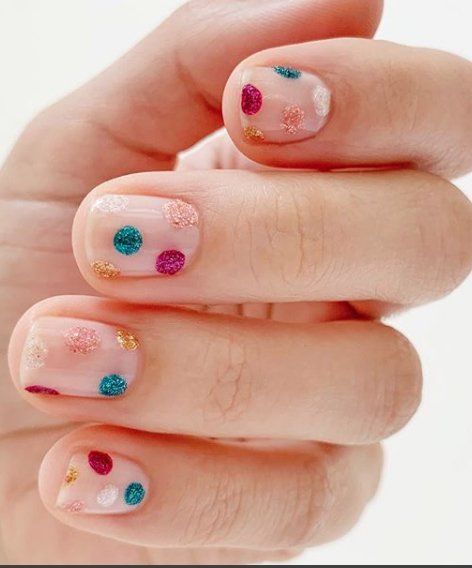 Para criá-la, no entanto, aposte em uma base transparente e em seguida preencha a unha com pequenas bolinhas coloridas com brilho. Vermelho, Azul, Dourado. Todas podem ser usadas facilmente. O efeito é incrível e charmoso.