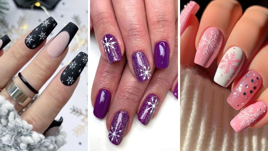 Para quem gosta de fugir do óbvio, as unhas roxas com glitter e detalhes de flocos de neve oferecem uma alternativa criativa.