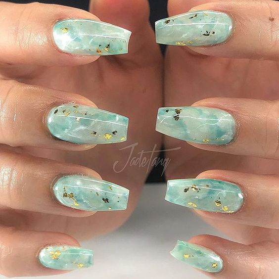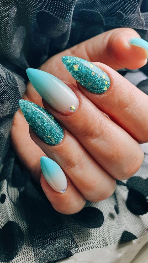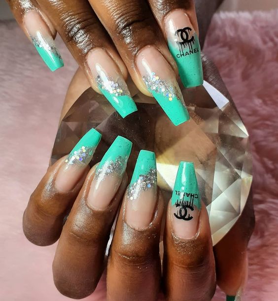 Assim como a mescla com outras cores, as unhas decoradas com a cor verde água podem ser facilmente aderidas à técnica encapsulada, ao adicionar glitter o resultado é incrível.