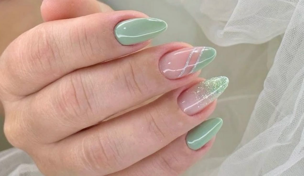 A transição entre o nude rosado e o verde claro cria um efeito elegante e delicado, perfeito para quem quer adicionar cor sem exageros. Além do degradê, o design ainda conta com uma unha decorada com linhas prateadas finas.