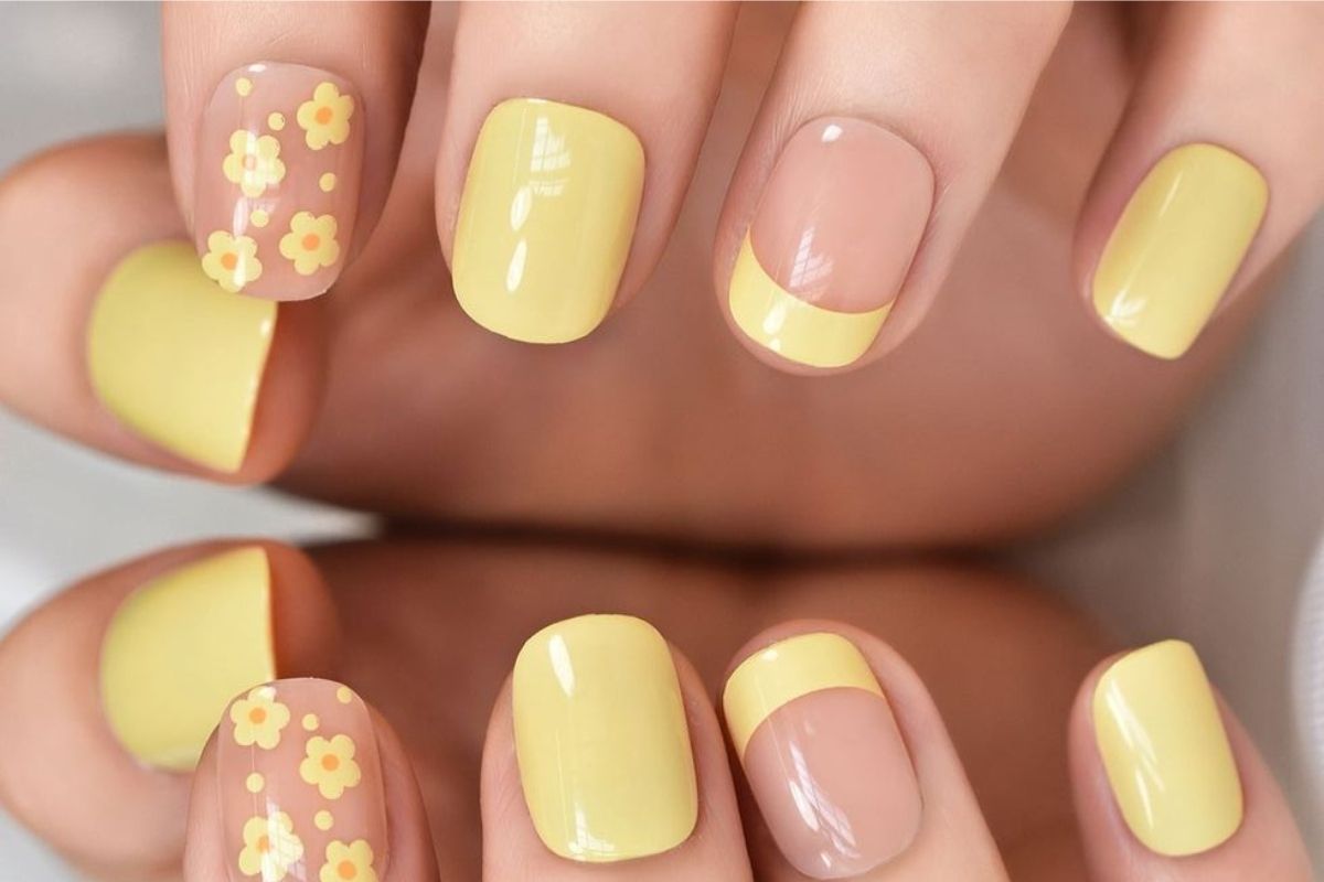 Por fim, o amarelo pastel é a cor da temporada, transmitindo alegria e leveza. Neste design, uma das unhas destaca-se com uma francesinha sutil, enquanto outra é adornada com delicadas flores amarelas.