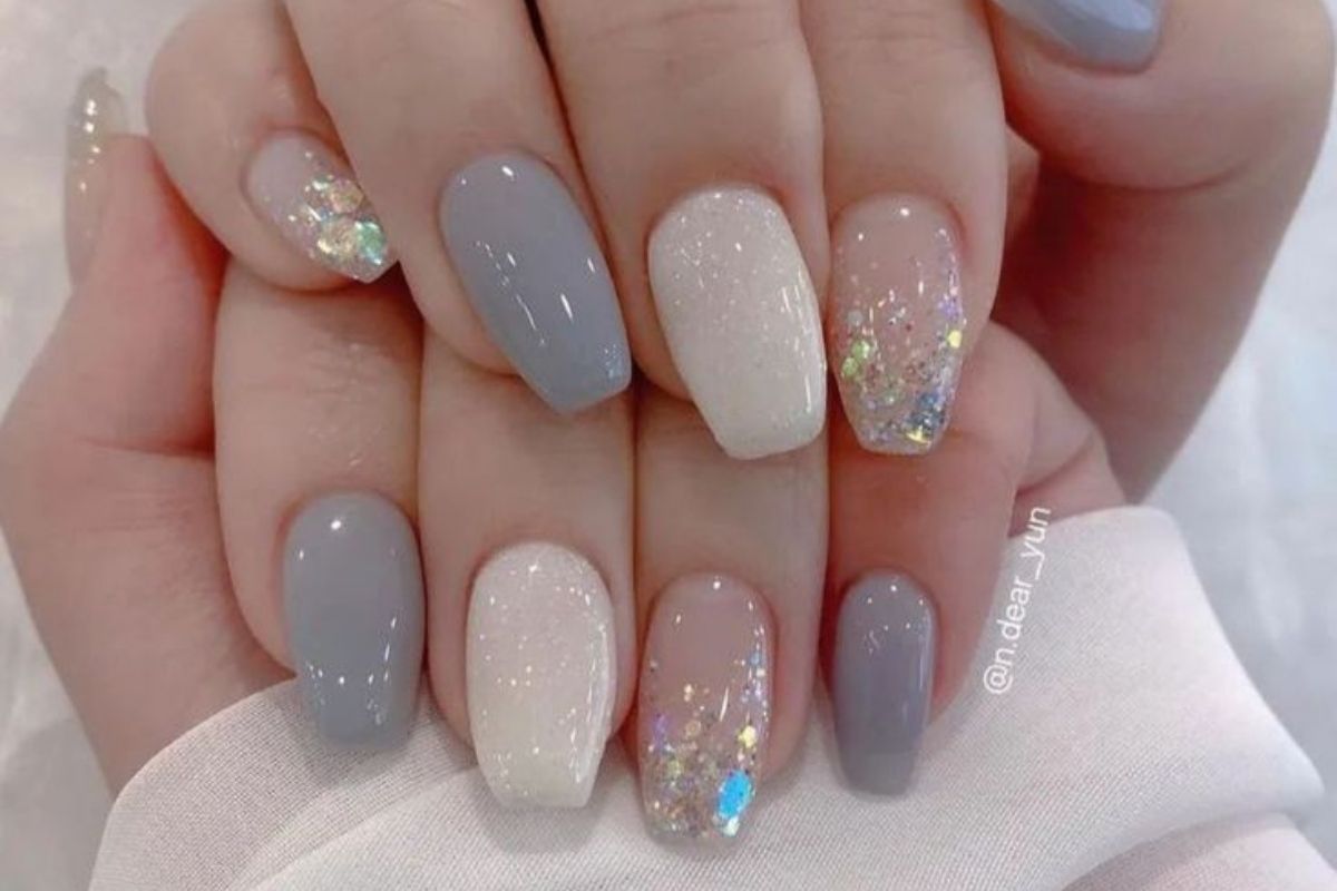 Alternando entre unhas pintadas de branco e azul pastel, duas unhas recebem uma camada extra de brilho com a aplicação de glitter. Esse mix de texturas e cores deixa o visual moderno e delicado, perfeito para quem deseja adicionar um toque de luz e cor às mãos sem exagero.
