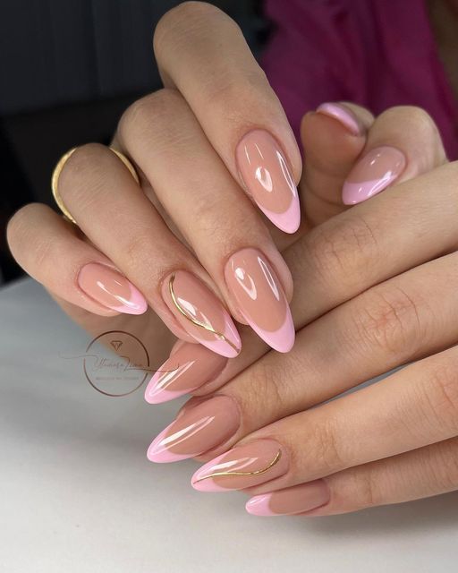 Unhas delicadas também podem trazer detalhes brilhosos se você quiser. Aqui aposte em detalhes dourados, por exemplo. Também insira um glitter transparente para elevar o charme.