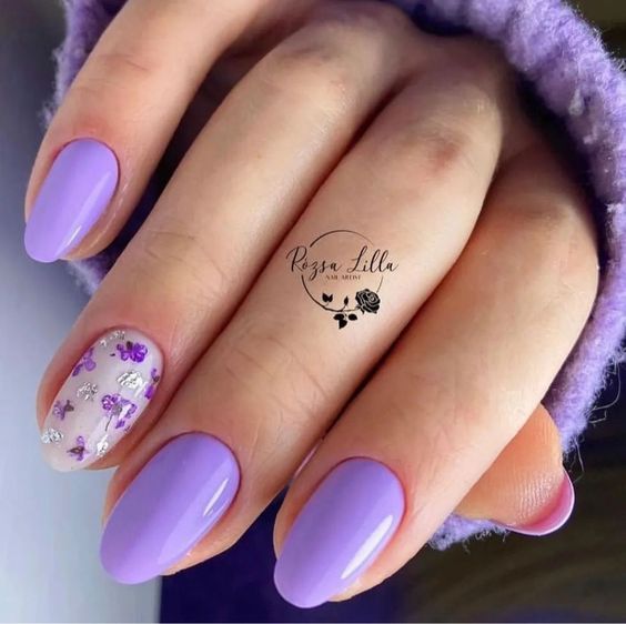 Aqui você pode pintar as unhas de lilás e adicionar pequenos pontos de brilho prateado ou dourado para um toque de encanto sutil. Isso dará um ar romântico e delicado às suas unhas.