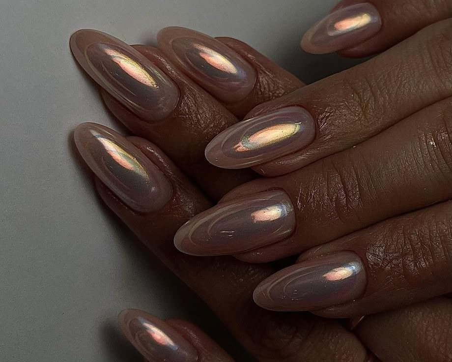 Se você ama o brilho metálico, mas prefere algo mais sutil, as Chrome Nails são a escolha ideal. Esmaltes cromados continuam em alta, mas com um twist: o efeito metálico agora aparece combinado a tons neutros e discretos, como rosa claro, bege ou nude.