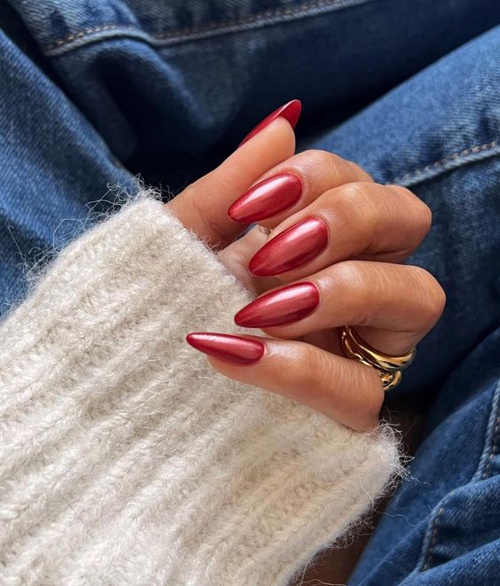 O esmalte vermelho metálico oferece brilho e sofisticação, com um toque futurista. Uma tendência forte para 2025.